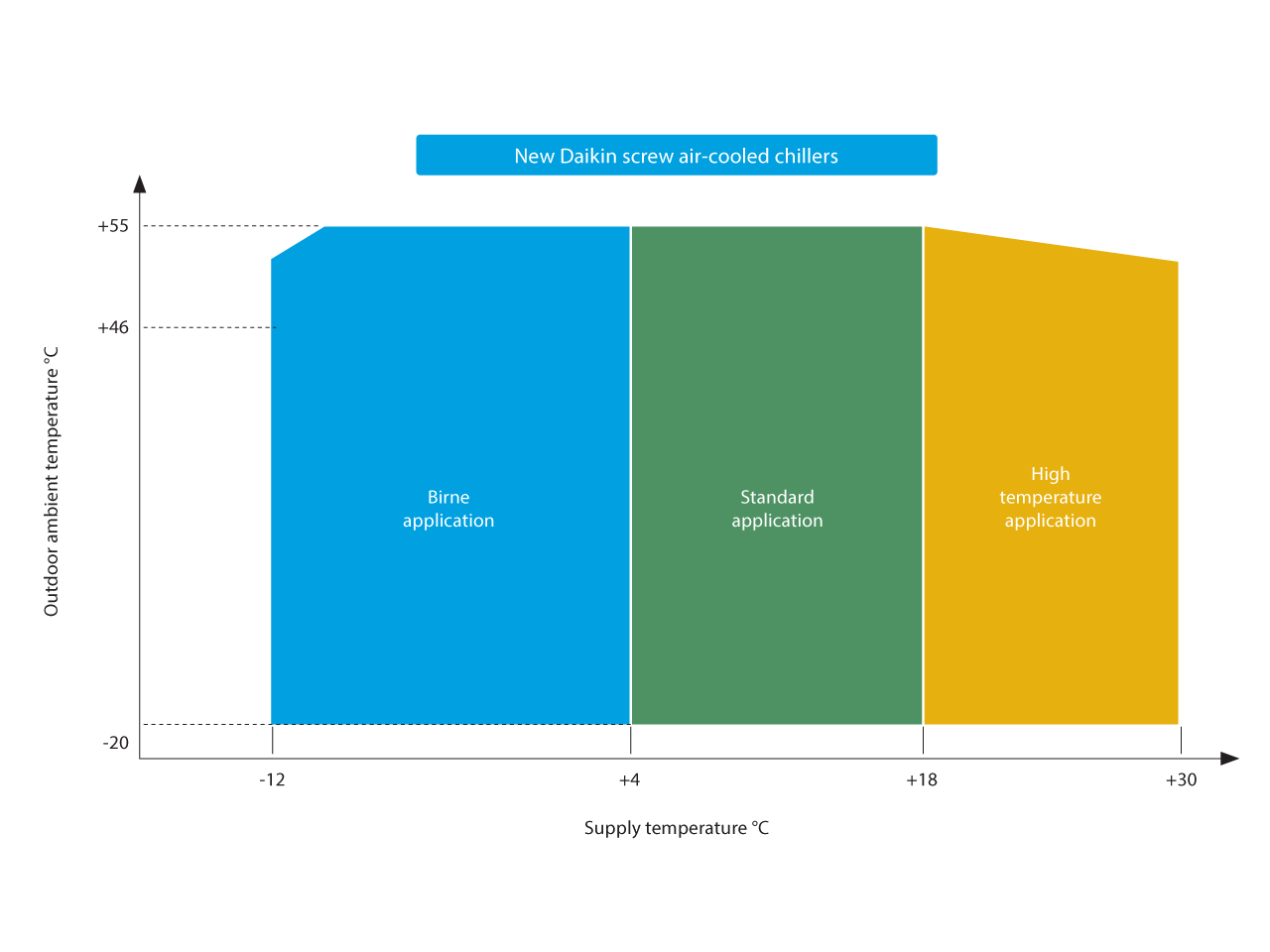 Блоки TZ D могут работать в широком диапазоне условий, что делает их пригодными для самых разных сфер применения. Они могут обеспечивать охлажденную воду для таких применений, как ледовые катки с температурой до -15°C, а также подходят для центров хранения и обработки данных, которым требуются более высокие температуры на выходе испарителя — до 30°C. Эта универсальность означает исключительную гибкость, позволяя блокам TZ D эффективно работать в широком диапазоне сред и климатов